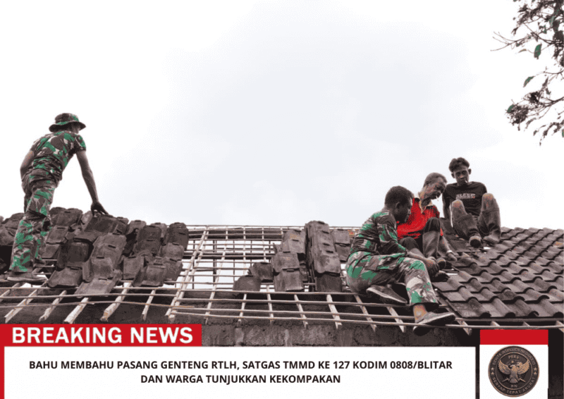 Beritaintelijennegara.id |Blitar – Anggota Satgas TMMD Ke-127 Kodim 0808/Blitar bersama warga bahu-membahu memasang genteng/atap dalam program renovasi Rumah Tidak Layak Huni (RTLH) milik Mbah Ayem di Dusun Krisik, Desa Krisik, Kecamatan Gandusari, Kabupaten Blitar, Selasa (24/2/2026). Kegiatan ini dilaksanakan dengan semangat gotong royong demi memastikan rumah yang direnovasi menjadi layak, aman, dan nyaman dihuni.