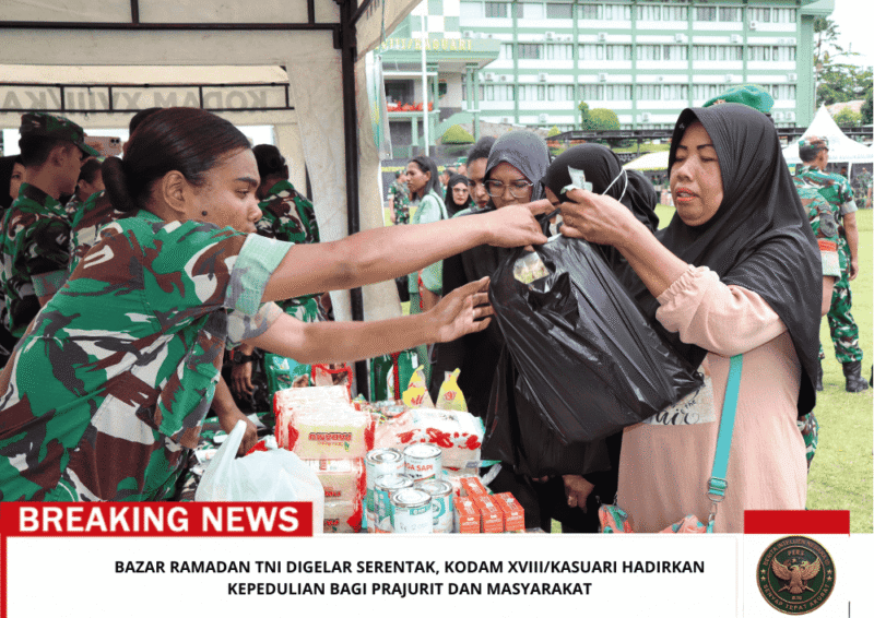 Beritaintelijennegara.id |Manokwari – Dalam rangka menyemarakkan bulan suci Ramadan sekaligus membantu meringankan kebutuhan masyarakat, Kodam XVIII/Kasuari menggelar Bazar Ramadan TNI di Makodam XVIII/Kasuari, pada Jumat (13/3/2026). Kegiatan ini menjadi wujud kepedulian TNI kepada prajurit, keluarga besar TNI, serta masyarakat sekitar agar dapat memperoleh kebutuhan pokok dengan harga yang lebih terjangkau selama bulan Ramadan.