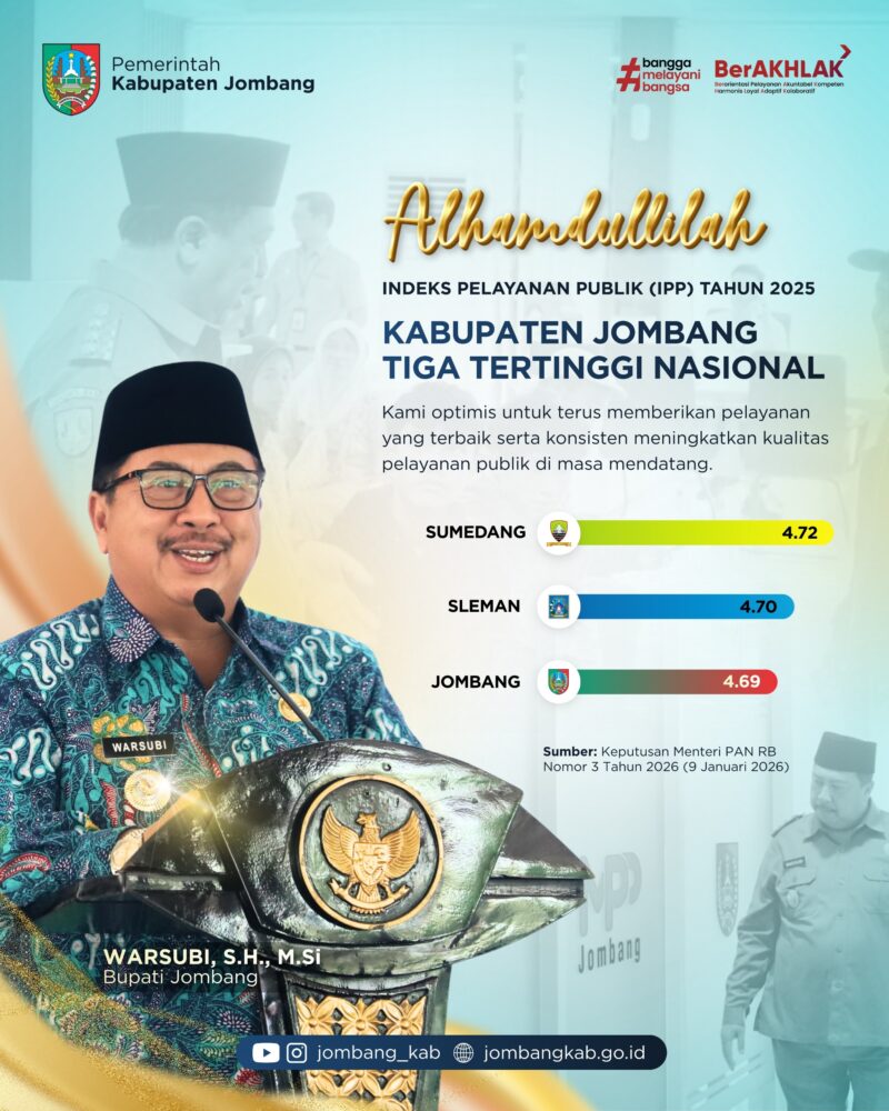 Berdasarkan Keputusan Menteri Pendayagunaan Aparatur Negara dan Reformasi Birokrasi (PANRB) Nomor 3 Tahun 2026, Kabupaten Jombang meraih skor tinggi sebesar 4.69 dengan predikat Kategori A (Pelayanan Prima) dari 415 Kabupaten di Indonesia. Prestasi ini menempatkan Jombang sebagai salah satu Pemerintah Kabupaten dengan tata kelola pelayanan publik terbaik di Indonesia.