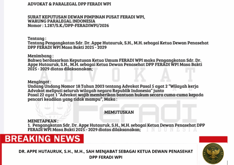 “Selasa lalu 17 Februari 2026 saya berkomunikasi dg Dr. Appe Hutauruk, S.H., M.H. berkaitan kesediaan beliau menjabat sebagai Ketua Dewan Penasehat Dewan Pimpinan Pusat FERADI WPI, dan Puji Tuhan beliau bersedia”. Dan telah terbit S.K. Penagangkatan Dr. Appe Hutauruk, S.H., M.H. sebagai Ketua Dewan Penasehat DPP FERADI WPI, S.K. terbit tanggal 18 Februari 2026. Sehingga Semenjak 18 Februari 2026 beliau secara resmi dan sah telah menjadi bagian pengurus DPP FERADI WPI.” Ujar Adv. Donny Ketum FERADI WPI.
