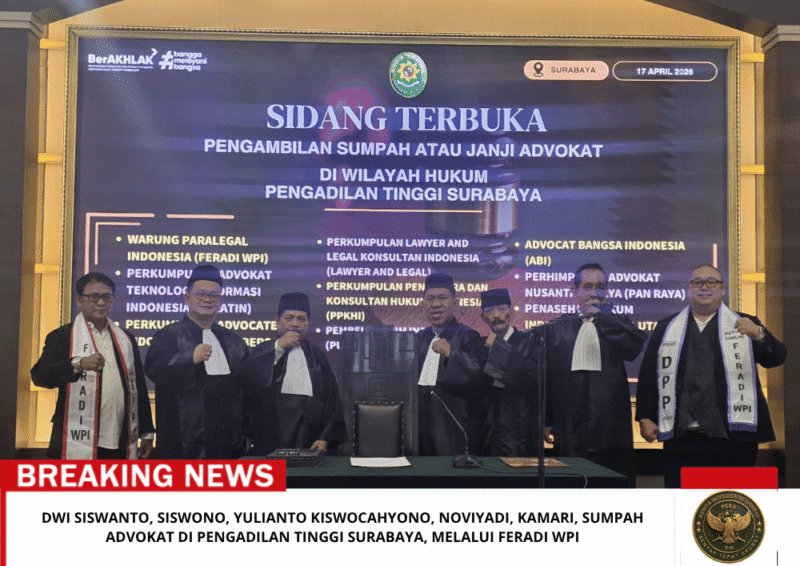 Beritaintelijennegara.id| SURABAYA — Organisasi advokat dan paralegal FERADI WPI menyelenggarakan pengambilan sumpah/janji advokat pada Jumat, 17 April 2026 di Aula Pengadilan Tinggi Jawa Timur, Kota Surabaya. Prosesi tersebut menjadi tahapan resmi bagi calon advokat sebelum menjalankan praktik profesi hukum sebagaimana diatur dalam Undang-Undang Nomor 18 Tahun 2003 tentang Advokat.