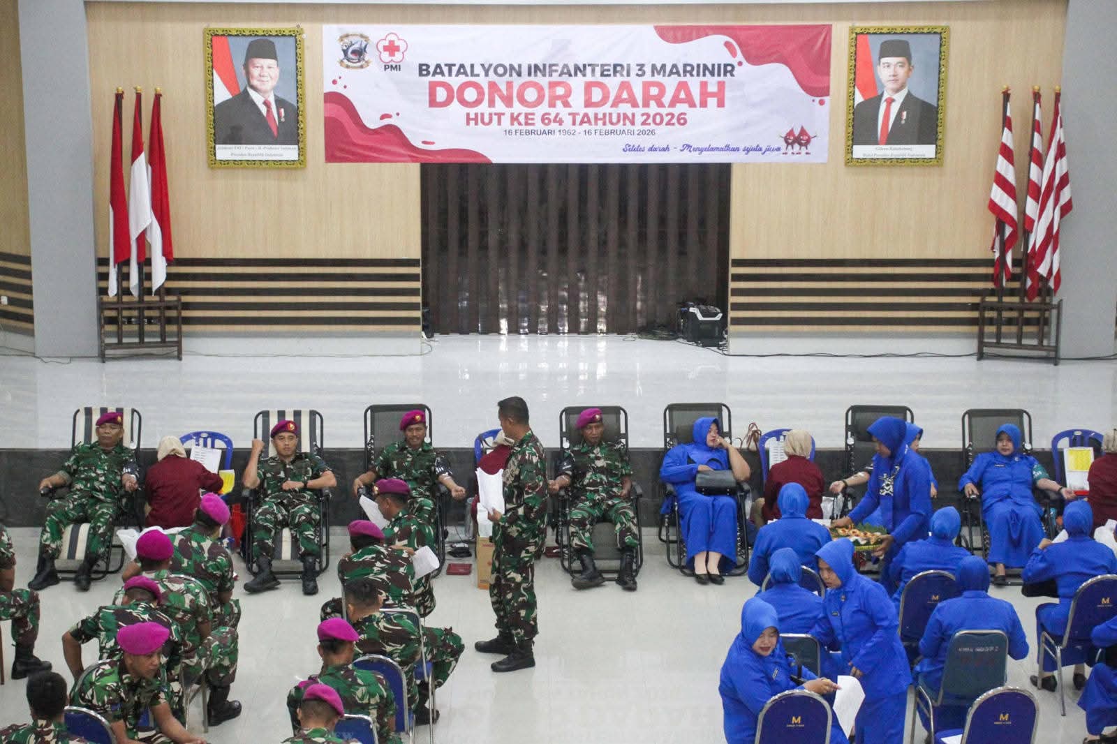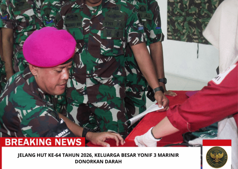 Beritaintelijennegara.id | Sidoarjo — TNI AL, Dispen Kormar (Sidoarjo). Menjelang peringatan HUT ke-64 tahun 2026 Batalyon Infanteri 3 Marinir, prajurit “Hiu Petarung” dan Jalasenastri menggelar kegiatan Donor Darah di Bapra Brigif 2 Marinir Gedangan, Sidoarjo, Jawa Timur. Kamis (05/02/2026).