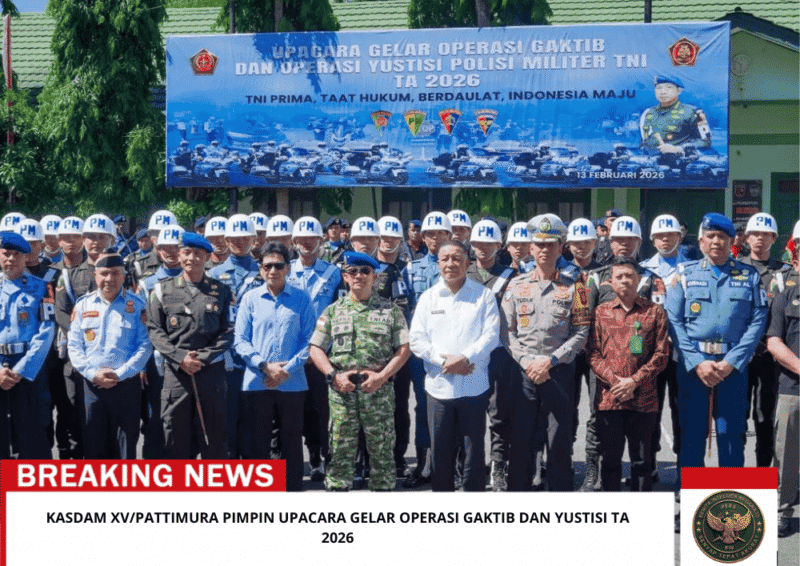 Beritaintelijennegara.id | Ambon — Kasdam XV/Pattimura Brigjen TNI Dr. H. Nefra Firdaus Lubis, S.E., M.M. mewakili Pangdam XV/Pattimura Mayjen TNI Putranto Gatot Sri Handoyo, S.Sos., M.M., memimpin Upacara Gelar Operasi Penegakan Ketertiban (Gaktib) dan Operasi Yustisi Tahun Anggaran 2026, di Lapangan Makodam XV/Pattimura, Ambon, pada Jumat (13/2/2026). Kasdam selalu Insperktur Upacara mengecek pasukan yang terlibat dalam upacara dengan mengenakan seragam green sage lengkap dengan baret berwarna biru Polisi Militer (PM).