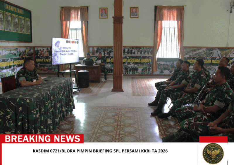 Beritaintelijennegara.id | Blora, 26 Maret 2026 – Kodim 0721/Blora melaksanakan kegiatan Briefing SPL Persami Korps Kadet Republik Indonesia (KKRI) Kodam IV/Diponegoro Tahun Anggaran 2026. Kegiatan tersebut dipimpin oleh Kepala Staf Kodim (Kasdim) 0721/Blora, Mayor Inf Bani, bertempat di Aula Makodim 0721/Blora, Jl. Pemuda No. 44 Blora.