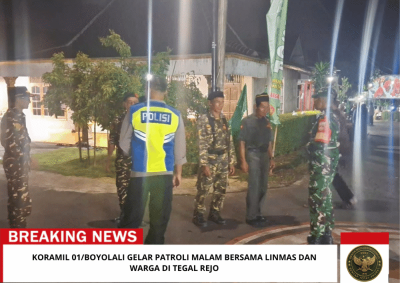 Beritaintelijennegara.id | Boyolali – Dalam rangka menjaga keamanan dan ketertiban masyarakat, anggota Koramil 01/Boyolali melaksanakan kegiatan patroli malam bersama Linmas dan warga di wilayah Desa Tegal Rejo, Kecamatan Sawit, Kabupaten Boyolali, pada Kamis malam (29/01/2026) pukul 23.00 WIB.
