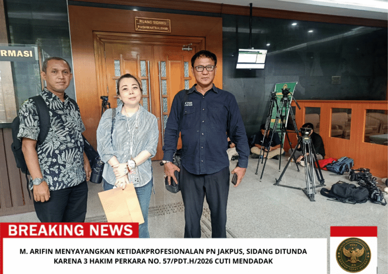 Beritaintelijennegara.id | Jakarta, 18 Februari 2026 — Agenda sidang di Pengadilan Negeri Jakarta Pusat dengan nomor perkara 57/Pdt.G/2026/PN Jkt.Pst . Ketua Hakim inisial H di tunda tiba tiba, karena tidak adanya komunikasi dari pihak PN Jakarta Pusat pemberitahuan kepada pada para pihak bahwa Majelis Hakim cuti mendadakan sehingga Sidang di tunda. Ujar M. Arifin.