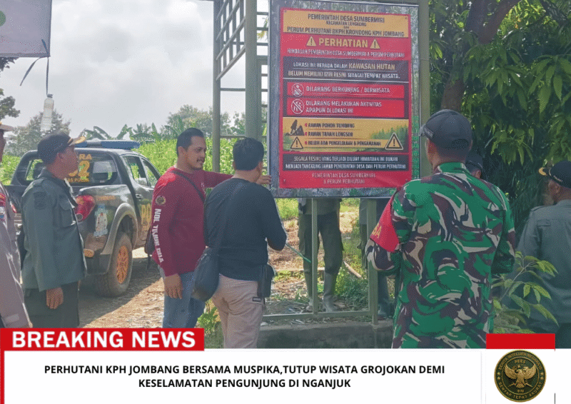 Beritaintelijennegara.id | JOMBANG, (17/04/2026) — Perhutani Kesatuan Pemangkuan Hutan (KPH) Jombang bersama Muspika Kecamatan Lengkong, Kabupaten Nganjuk, menutup Wisata Kali Grojokan Duwur, guna menghindari timbul korban karena lokasi tebing berbahaya, curah hujan tinggi berpotensi air bah (luapan air deras yang datang tiba-tiba dari atas), longsor, pohon tumbang, dan licin saat hujan.