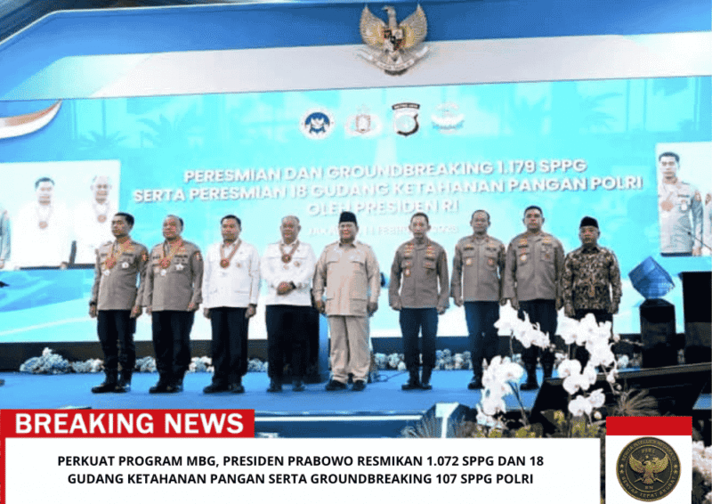 Beritaintelijennegara.id | Jakarta — Presiden Prabowo Subianto meresmikan 1.072 Satuan Pelayanan Pemenuhan Gizi (SPPG) dan 18 Gudang Ketahanan Pangan serta groundbreaking 107 SPPG Polri di seluruh Indonesia. Kegiatan tersebut digelar di SPPG Polri Palmerah, Jakarta, Jumat (13/02/2026). Peresmian tersebut menegaskan komitmen pemerintah terhadap Program Makan Bergizi Gratis (MBG) sebagai langkah strategis membangun kualitas sumber daya manusia Indonesia.