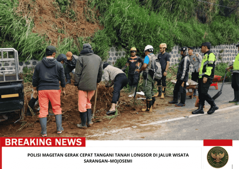 Beritaintelijennegara.id |Magetan – Aparat Kepolisian bersama Badan Penanggulangan Bencana Daerah (BPBD) Kabupaten Magetan, TNI dan Masyarakat bergerak cepat menangani peristiwa tanah longsor yang terjadi di Jalan Raya Sarangan–Mojosemi, tepatnya di tikungan 300 meter barat Omah Jowo, termasuk wilayah Kelurahan Sarangan, Kecamatan Plaosan, Sabtu (28/2/2026) sekitar pukul 06.00 WIB.