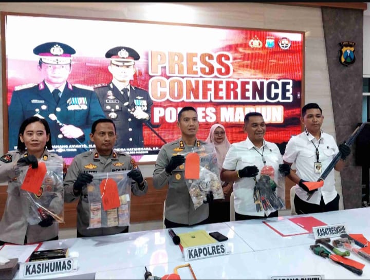 Beritaintelijennegara.id | Madiun- Polres Madiun mengungkap jaringan pencurian toko yang meresahkan warga sejak akhir 2025. Penggerebekan dipimpin Kapolres Madiun AKBP Kemas Indra Natanegara, S.H., S.I.K., M.Si., bersama Kasatreskrim AKP Agus Andi Anto Prabowo dan Kasi Humas Iptu Anita Dyah Puspitosari, S.H., di Aula Gedung TS Polres Madiun, Kamis (15/1/2026).