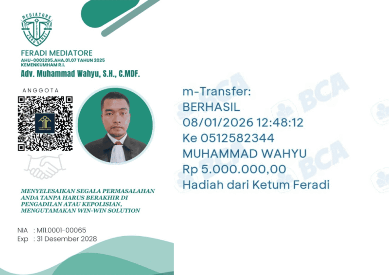 “Ini adalah Kuasa Tuhan. FERADI MEDIATORE secara sah diakui di Pengadilan Negeri. Lulusan kita diterima resmi berbekal sertifikat kami. Ada tangan Tuhan dan keajaiban di sini. Apresiasi ini adalah bentuk syukur kami karena Wahyu membuktikan bahwa keterbatasan ekonomi bukan penghalang untuk berprestasi,” tegas Donny Andretti selaku Ketua Umum FERADI MEDIATORE