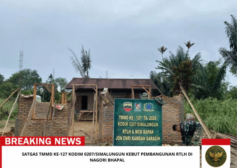 Simalungun, 17 Februari 2026 – Semangat gotong royong terus berkobar dalam pelaksanaan program TNI Manunggal Membangun Desa (TMMD) ke-127 oleh Kodim 0207/Simalungun. Pada Selasa (17/2), personel Satgas TMMD kembali melanjutkan pengerjaan Rumah Tidak Layak Huni (RTLH) milik Bapak Jon Enri Kamsah Saragih yang berlokasi di Nagori Bhapal, Kecamatan Raya, Kabupaten Simalungun.