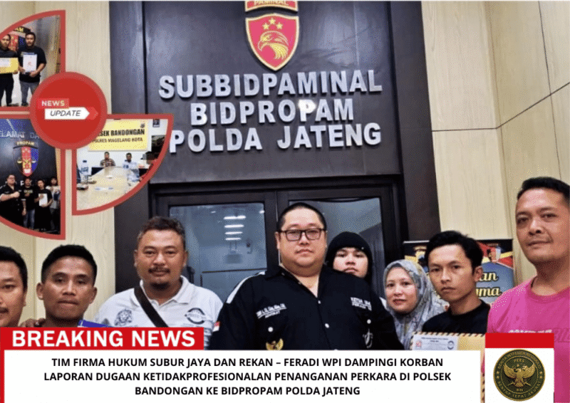 Beritaintelijennegara.id| Semarang, 15 Februari 2026 – Tim Firma Hukum Subur Jaya dan Rekan bersama Organisasi Advokat FERADI WPI secara resmi mendampingi korban bernama Nurohim dalam menyampaikan pengaduan ke Bidang Profesi dan Pengamanan (Bidpropam) Polda Jawa Tengah, Minggu (15/02/2026).