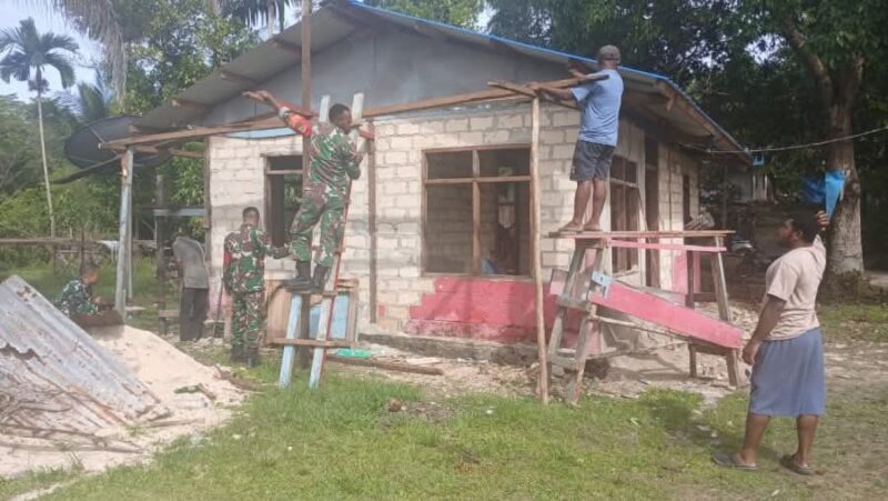 Wujud Kemanunggalan TNI, Babinsa Posramil Biak Timur Gotong Royong Bangun Rumah Warga